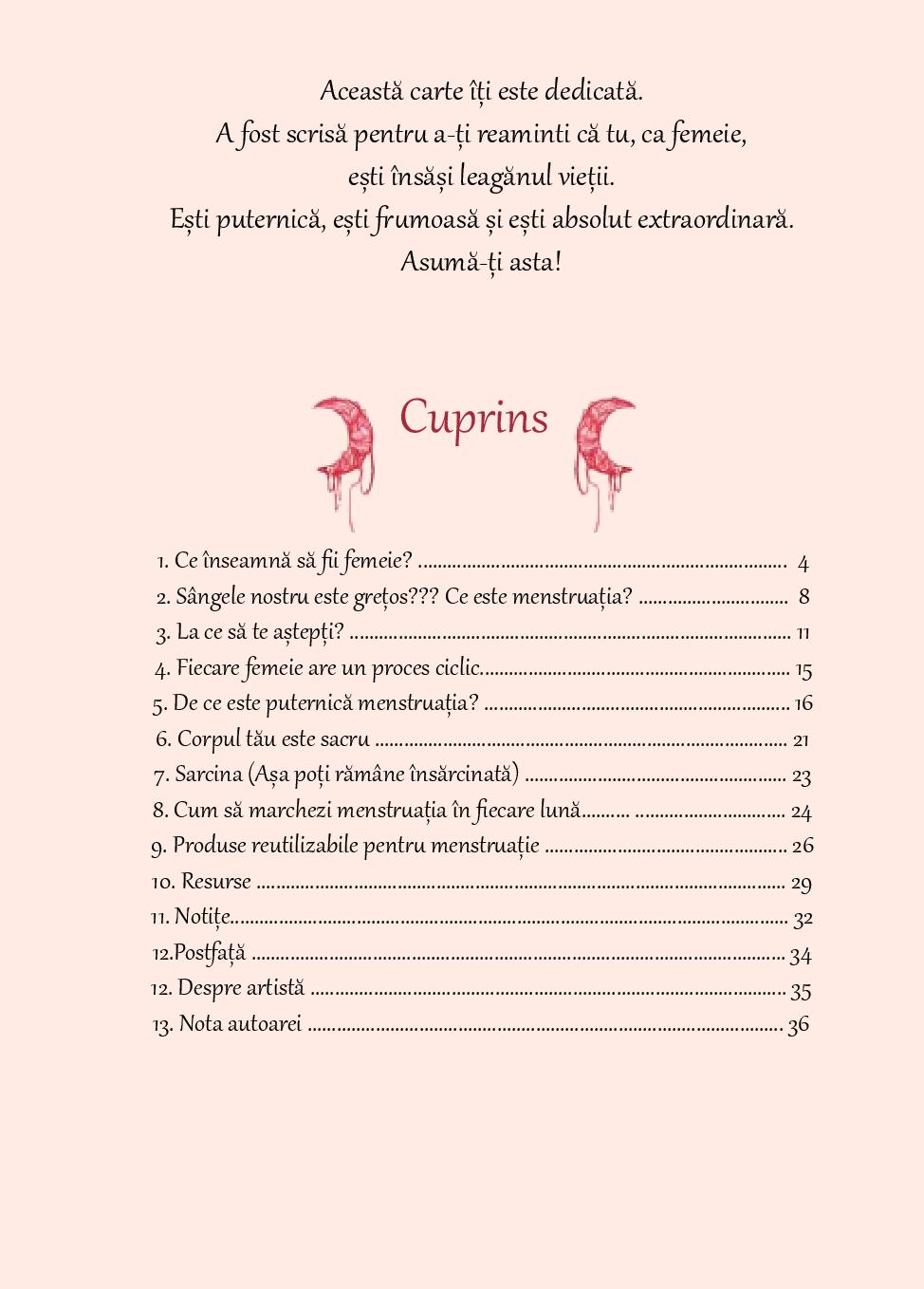 O carte simplă, ilustrată artistic, care re-aduce sacralitatea femininului într-un limbaj simplu și ușor de înțeles de către fetele tinere ce au trecut pragul primei menstruații sau se pregătesc pentru ea.