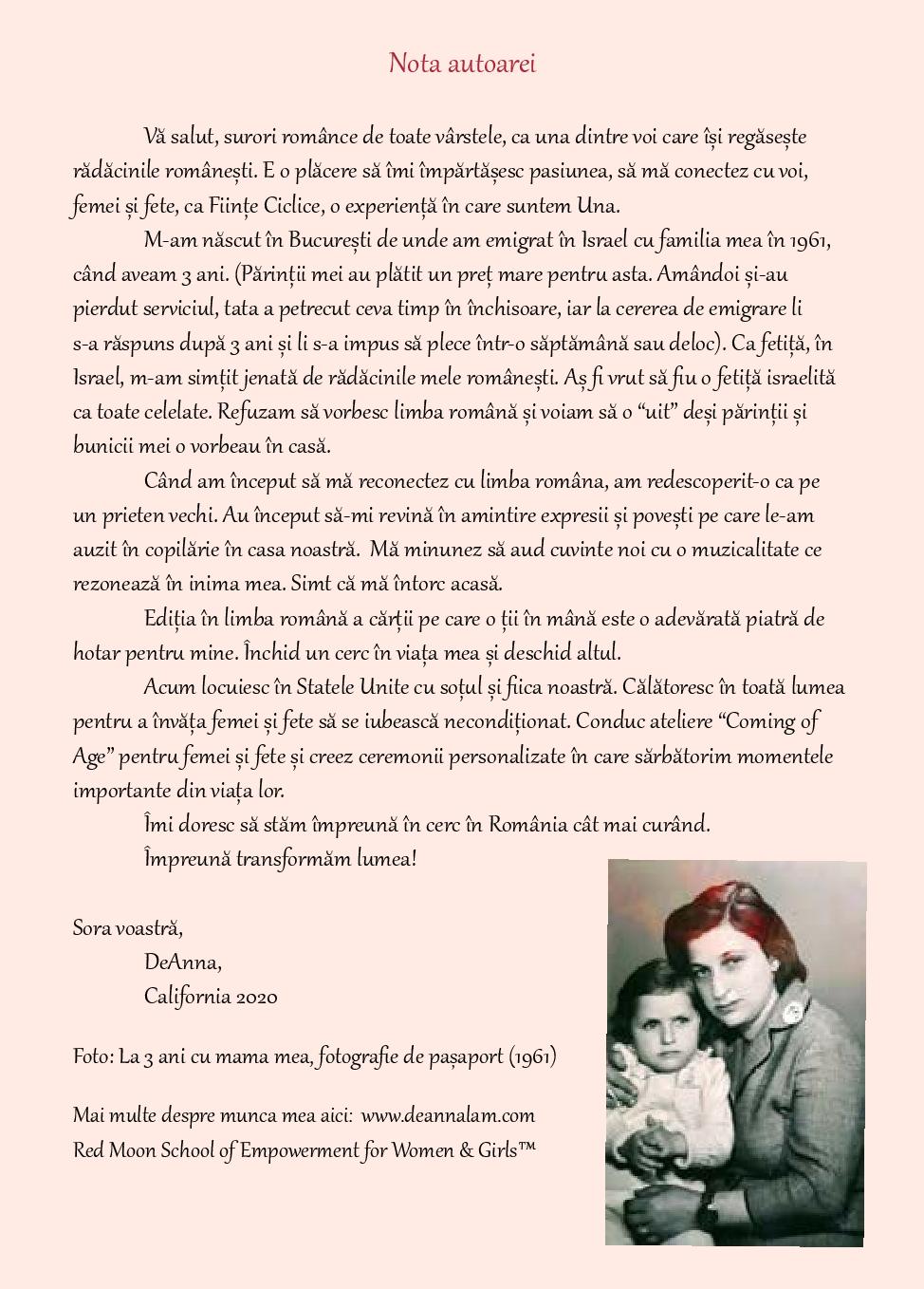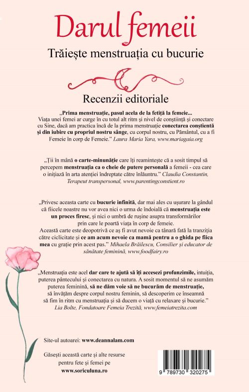 Această carte este deopotrivă ce aș fi avut nevoie ca tânară fată la tranziția către ciclicitate și ce am acum nevoie ca mamă pentru a o ghida pe fiica mea cu grație prin acest pas. Mihaela Brăilescu, Consilier și educator de sănătate feminină, www.foodfairy.ro